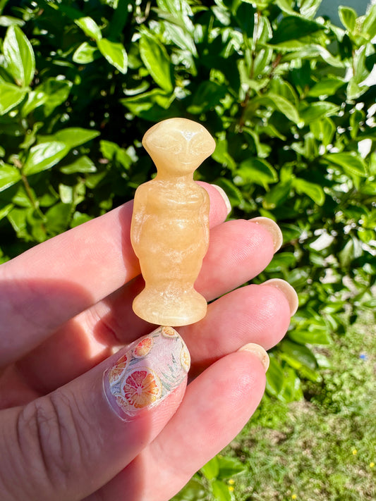 Yellow Calcite Alien Carving: Unique Handcrafted Extraterrestrial Figurine, Ideal for Sci-Fi Fans and Collectors of Novelty Crystal Decor